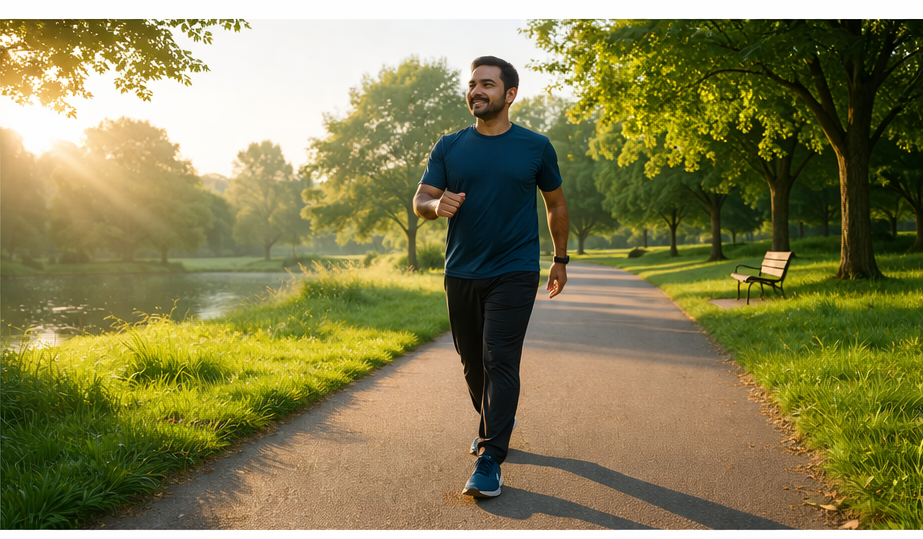 সকালের পার্কে একজন মানুষ দ্রুত হাঁটছেন, চারপাশে সবুজ গাছ ও নির্মল পরিবেশ—হাঁটার উপকারিতার প্রতীকী ছবি